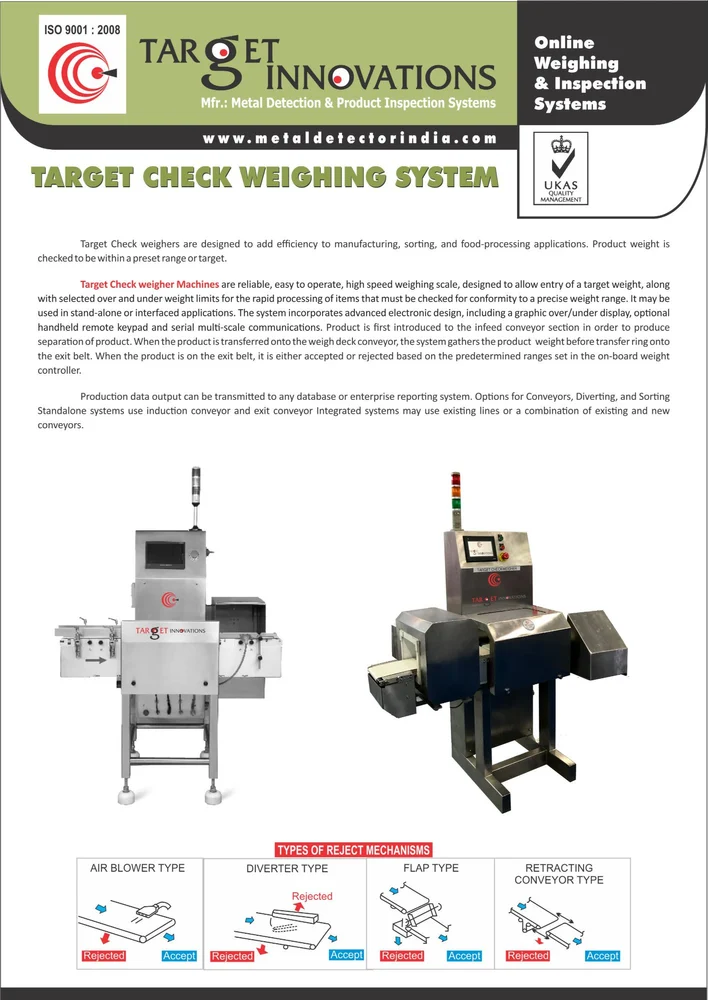 Metal Detector India- Target innovations are a certified company that is constantly innovating new methods to manufacture checkweigher. Our company is renowned as famous check weigher system manufacturer in India. We are backed by high-tech manufacturing unit and have efficient and modern designing detectors that are offering excellent equipments to the customers. Our products are accurate with high speed for weight checking.